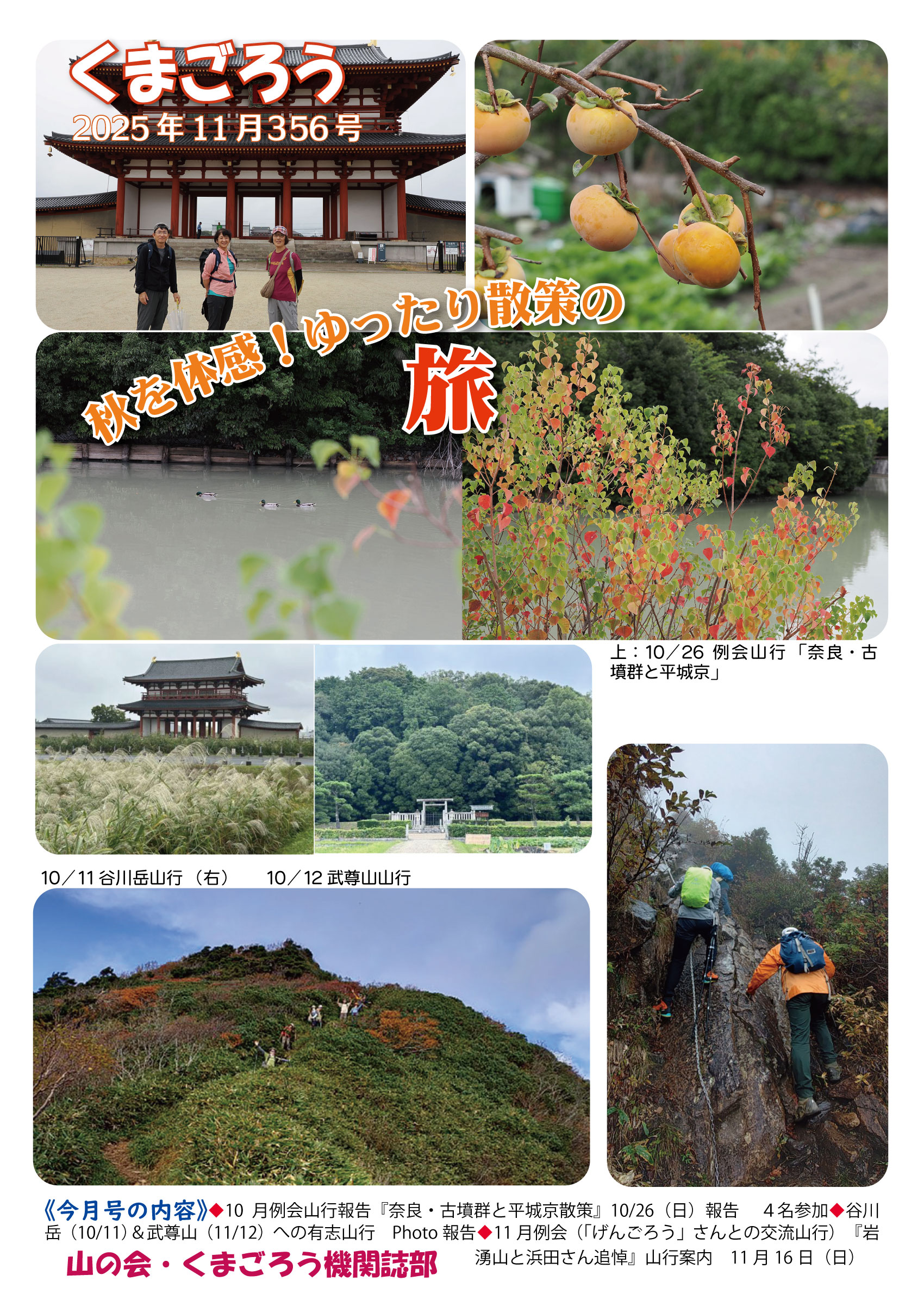 ◆表紙:◆10月例会山行報告『奈良・古墳群と平城京散策』 10/26(日)4名参加。◆谷川岳(10/11)&武尊山(11/12)への有志山行 Photo報告。◆11月例会(「げんごろう」さんとの交流山行)案内 ~「岩湧山」&浜田さん追悼登山 11月16日(日)9時紀見峠駅集合