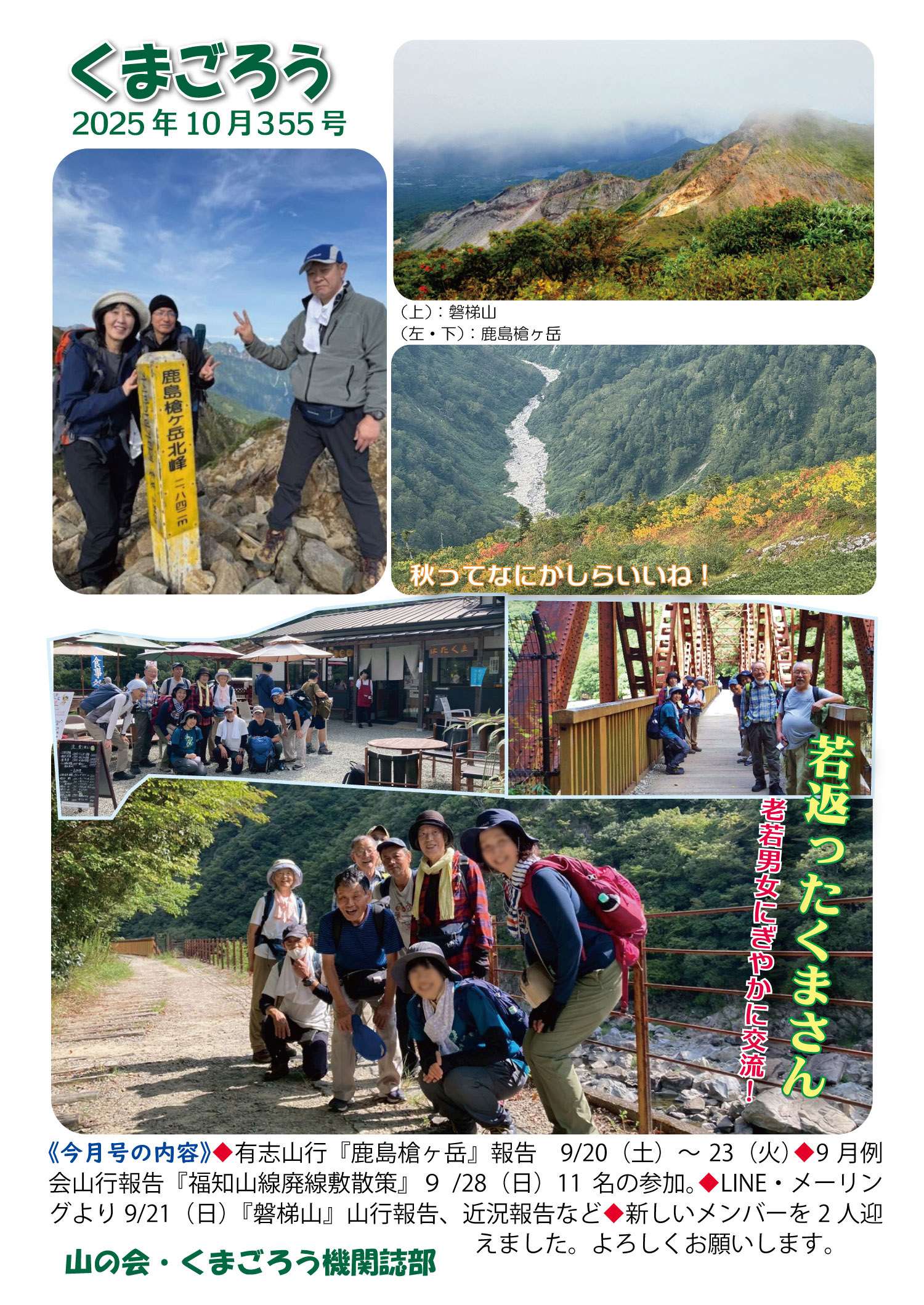 ◆有志山行『鹿島槍ヶ岳』報告 9/20(土)~23(火)3名参加◆9月例会山行報告『福知山線廃線敷散策』~9/28(日)11名の参加。◆LINE・メーリングリストからのフォト&報告が入っています。 21(日)『磐梯山』山行フォト報告。近況報告など◆くまごろうに新しいメンバーを2人迎えました。よろしくお願いします。◆10月の機関誌作成日は10月22日(水)を予定日とします。原稿は10月20日(月)頃までにお願いします。