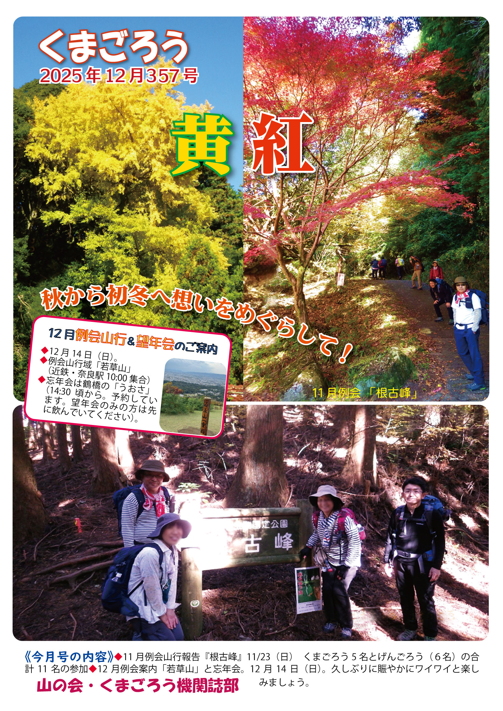 ◆表紙:◆11月例会山行報告『根古峰』11/23(日) くまごろう5名とげんごろう(6名)の仲間たち11名の参加。◆12月例会案内「若草山」と忘年会~12月14日(日)。久しぶりに賑やかにワイワイと楽しみましょう。