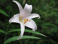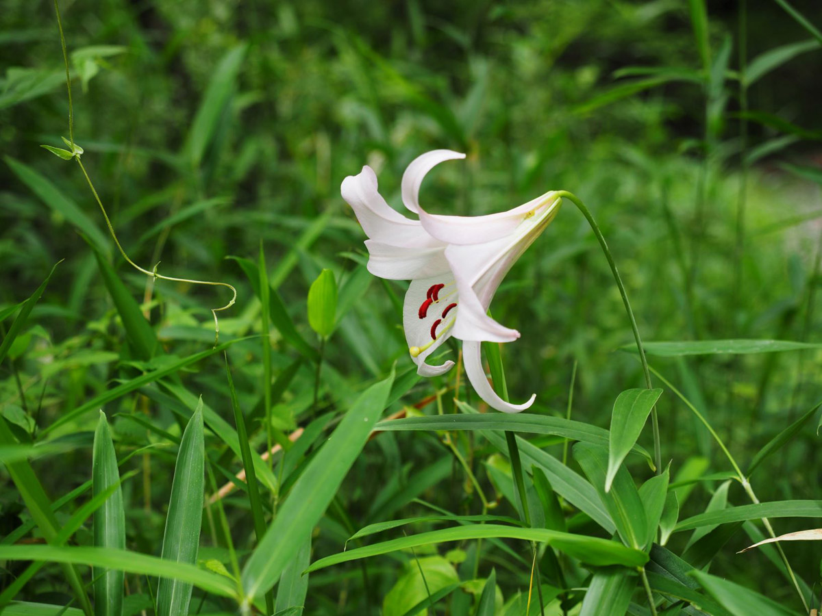 14.40 場、交流館がある。 左右に池ありその間を歩いて 追分道の標識に沿って下りていくと突然大声を上げて皆を驚かしました。ササユリが咲いていたのです。