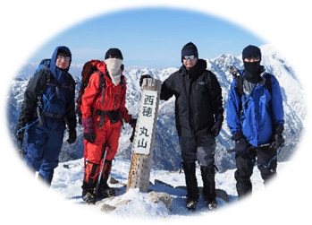 ここからアイゼンを付け西穂山荘に向かいます。トレースもあり締まった雪にアイゼンが利き快適に登っていけます。直登の冬道を進んでいくと1時間半程で西穂山荘に到着。名物の大きな雪だるまが鎮座しお出迎え。西穂山荘(2367m)は通年営業で厳冬期は有り難い小屋です。ここから上は森林限界。天気は快晴でまぶしいほど!ピッケルをシュリンゲで結び、休憩もそこそこに西穂丸山(2452m)を目指して登る事20分程で到着。見渡す限り絶景が広がります。南には焼岳、その向こうに乗鞍岳、笠ヶ岳から双六岳に続く稜線の峰々。今日は空気も澄み遠く富士山も確認できました。