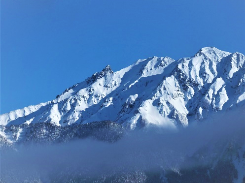 トンネルまではあと少し。緩い坂道の先に焼岳が顔を出し始め、振り返ると明神から前穂も見えます。名残惜しいですが、これでお別れです。ガイドさん曰く「昨日の上高地は年に一度あるかないか?の快晴の一日でしたが、今日も皆さんかなり恵まれている」との事。穂高連峰が時々顔を出してくれ冬の上高地を満喫できました。下山後、新穂高中尾温泉に移動。部屋の窓からは槍の穂先が見えました。天気も好くなりつつあり明日の西穂に期待が膨らみます!。