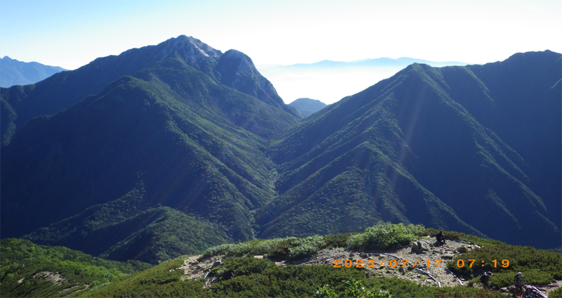 【7/17】 AM4時半、長衛小屋テン場出発。小橋を渡る登り口をスタートし暫く樹林の中のトラバース道を進む。徐々に朝日も差込み天気も好さそうです。40分程で2合目に着き北沢峠からの尾根道と合流。3合目を過ぎると左手に三角錐の北岳の頭が見え、肩の小屋が朝日に照らされ光っています。4合目を過ぎ暫くで5合目の大滝頭にでます。ここで道は二手に分かれ、右は藪沢からカールを経て頂上へ。左は尾根通しで小仙丈ヶ岳経由で頂上へ向かう展望コース。我々は左の尾根通しで頂上を目指します。コメツガ、シラビソの樹林帯を抜け6合目に出ると視界が開け、甲斐駒から鳳凰三山のオベリスク、その右の北岳の頂きへと延びる稜線の後ろに富士山が頭を覗かせます。甲斐駒の左奥には八ヶ岳連峰、北に目を転じると北アルプスの峰々が。中でも槍ヶ岳だけは尖った穂先ですぐにそれと分かります。